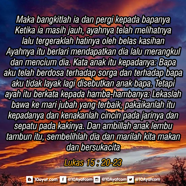 Maka bangkitlah ia dan pergi kepada bapanya. Ketika ia masih jauh, ayahnya telah melihatnya, lalu tergeraklah hatinya oleh belas kasihan. Ayahnya itu berlari mendapatkan dia lalu merangkul dan mencium dia. Kata anak itu kepadanya: Bapa, aku telah berdosa terhadap sorga dan terhadap bapa, aku tidak layak lagi disebutkan anak bapa. Tetapi ayah itu berkata kepada hamba-hambanya: Lekaslah bawa ke mari jubah yang terbaik, pakaikanlah itu kepadanya dan kenakanlah cincin pada jarinya dan sepatu pada kakinya. Dan ambillah anak lembu tambun itu, sembelihlah dia dan marilah kita makan dan bersukacita.