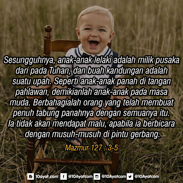 Sesungguhnya, anak-anak lelaki adalah milik pusaka dari pada Tuhan, dan buah kandungan adalah suatu upah. Seperti anak-anak panah di tangan pahlawan, demikianlah anak-anak pada masa muda. Berbahagialah orang yang telah membuat penuh tabung panahnya dengan semuanya itu. Ia tidak akan mendapat malu, apabila ia berbicara dengan musuh-musuh di pintu gerbang.