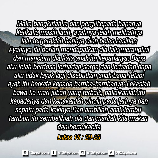 Maka bangkitlah ia dan pergi kepada bapanya. Ketika ia masih jauh, ayahnya telah melihatnya, lalu tergeraklah hatinya oleh belas kasihan. Ayahnya itu berlari mendapatkan dia lalu merangkul dan mencium dia.Kata anak itu kepadanya: Bapa, aku telah berdosa terhadap sorga dan terhadap bapa, aku tidak layak lagi disebutkan anak bapa.Tetapi ayah itu berkata kepada hamba-hambanya: Lekaslah bawa ke mari jubah yang terbaik, pakaikanlah itu kepadanya dan kenakanlah cincin pada jarinya dan sepatu pada kakinya.Dan ambillah anak lembu tambun itu, sembelihlah dia dan marilah kita makan dan bersukacita.