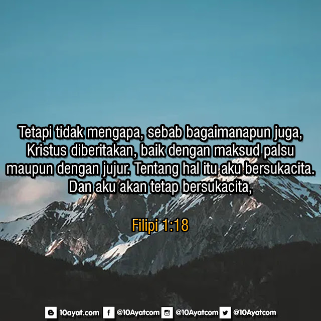 Tetapi tidak mengapa, sebab bagaimanapun juga, Kristus diberitakan, baik dengan maksud palsu maupun dengan jujur. Tentang hal itu aku bersukacita. Dan aku akan tetap bersukacita,