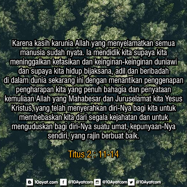 Karena kasih karunia Allah yang menyelamatkan semua manusia sudah nyata. Ia mendidik kita supaya kita meninggalkan kefasikan dan keinginan-keinginan duniawi dan supaya kita hidup bijaksana, adil dan beribadah di dalam dunia sekarang ini dengan menantikan penggenapan pengharapan kita yang penuh bahagia dan penyataan kemuliaan Allah yang Mahabesar dan Juruselamat kita Yesus Kristus, yang telah menyerahkan diri-Nya bagi kita untuk membebaskan kita dari segala kejahatan dan untuk menguduskan bagi diri-Nya suatu umat, kepunyaan-Nya sendiri, yang rajin berbuat baik.