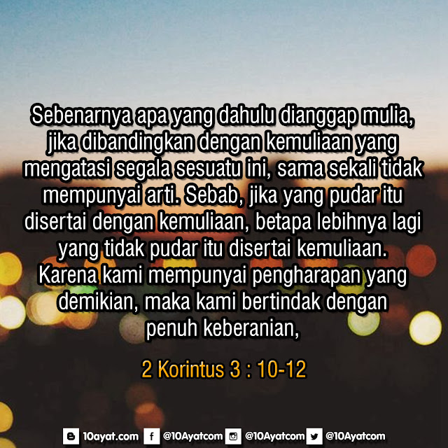 Sebenarnya apa yang dahulu dianggap mulia, jika dibandingkan dengan kemuliaan yang mengatasi segala sesuatu ini, sama sekali tidak mempunyai arti. Sebab, jika yang pudar itu disertai dengan kemuliaan, betapa lebihnya lagi yang tidak pudar itu disertai kemuliaan. Karena kami mempunyai pengharapan yang demikian, maka kami bertindak dengan penuh keberanian,