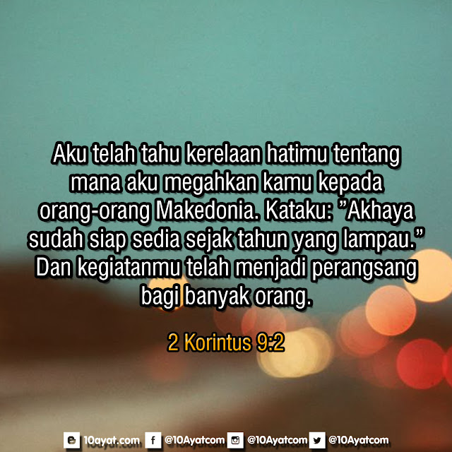 Aku telah tahu kerelaan hatimu tentang mana aku megahkan kamu kepada orang-orang Makedonia. Kataku: ”Akhaya sudah siap sedia sejak tahun yang lampau.” Dan kegiatanmu telah menjadi perangsang bagi banyak orang.