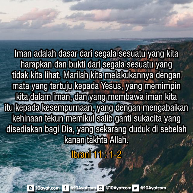 Iman adalah dasar dari segala sesuatu yang kita harapkan dan bukti dari segala sesuatu yang tidak kita lihat. Marilah kita melakukannya dengan mata yang tertuju kepada Yesus, yang memimpin kita dalam iman, dan yang membawa iman kita itu kepada kesempurnaan, yang dengan mengabaikan kehinaan tekun memikul salib ganti sukacita yang disediakan bagi Dia, yang sekarang duduk di sebelah kanan takhta Allah.