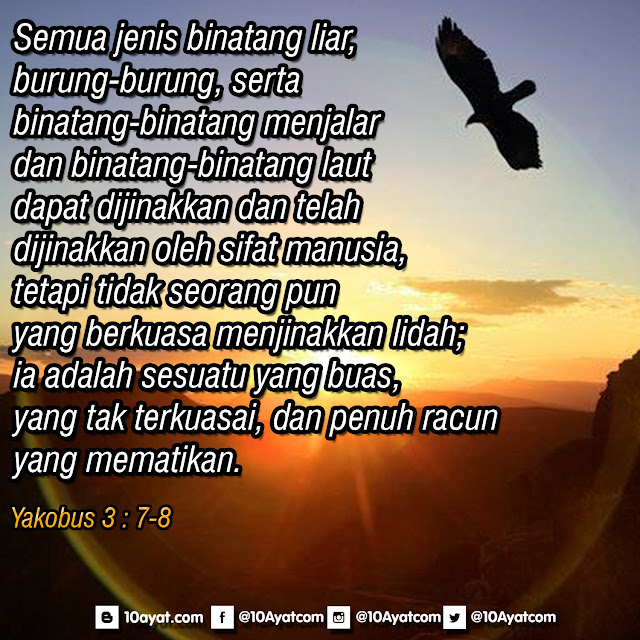 Semua jenis binatang liar, burung-burung, serta binatang-binatang menjalar dan binatang-binatang laut dapat dijinakkan dan telah dijinakkan oleh sifat manusia, tetapi tidak seorang pun yang berkuasa menjinakkan lidah; ia adalah sesuatu yang buas, yang tak terkuasai, dan penuh racun yang mematikan.