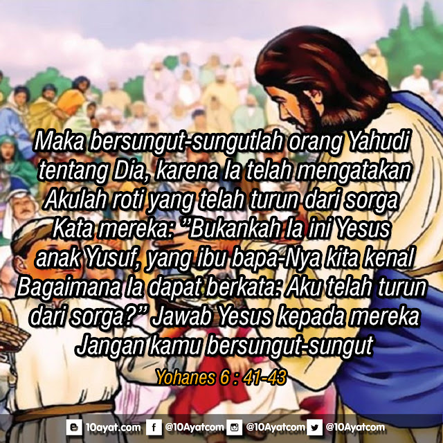 Maka bersungut-sungutlah orang Yahudi tentang Dia, karena Ia telah mengatakan: ”Akulah roti yang telah turun dari sorga.” Kata mereka: ”Bukankah Ia ini Yesus, anak Yusuf, yang ibu bapa-Nya kita kenal? Bagaimana Ia dapat berkata: Aku telah turun dari sorga?” Jawab Yesus kepada mereka: ”Jangan kamu bersungut-sungut.