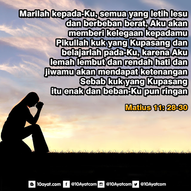 Marilah kepada-Ku, semua yang letih lesu dan berbeban berat, Aku akan memberi kelegaan kepadamu. Pikullah kuk yang Kupasang dan belajarlah pada-Ku, karena Aku lemah lembut dan rendah hati dan jiwamu akan mendapat ketenangan. Sebab kuk yang Kupasang itu enak dan beban-Ku pun ringan.”