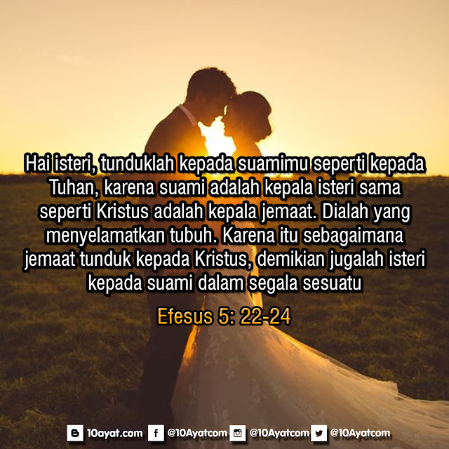 Hai isteri, tunduklah kepada suamimu seperti kepada Tuhan, karena suami adalah kepala isteri sama seperti Kristus adalah kepala jemaat. Dialah yang menyelamatkan tubuh. Karena itu sebagaimana jemaat tunduk kepada Kristus, demikian jugalah isteri kepada suami dalam segala sesuatu.