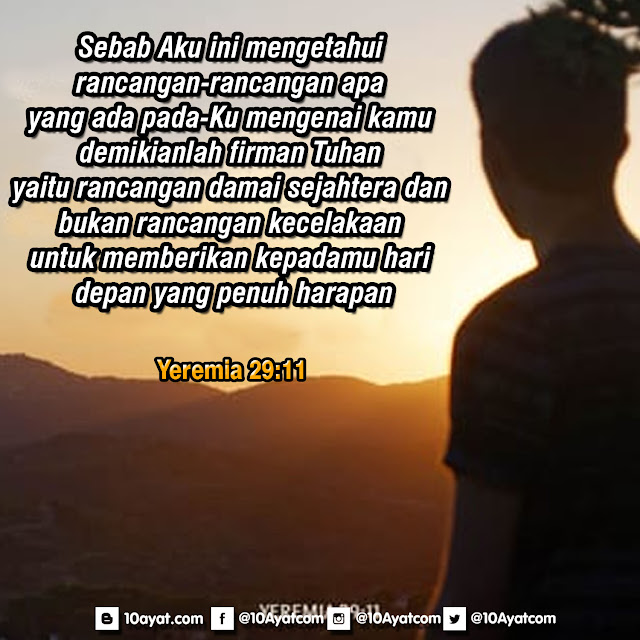 Sebab Aku ini mengetahui rancangan-rancangan apa yang ada pada-Ku mengenai kamu, demikianlah firman Tuhan, yaitu rancangan damai sejahtera dan bukan rancangan kecelakaan, untuk memberikan kepadamu hari depan yang penuh harapan.