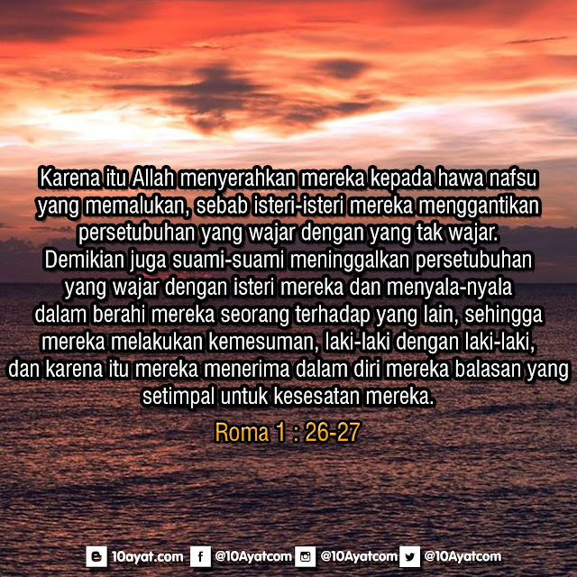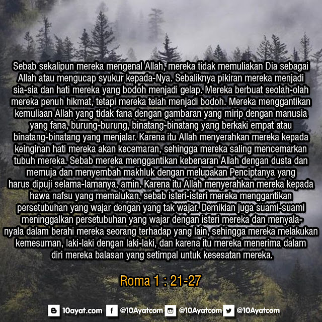 Sebab sekalipun mereka mengenal Allah, mereka tidak memuliakan Dia sebagai Allah atau mengucap syukur kepada-Nya. Sebaliknya pikiran mereka menjadi sia-sia dan hati mereka yang bodoh menjadi gelap. Mereka berbuat seolah-olah mereka penuh hikmat, tetapi mereka telah menjadi bodoh. Mereka menggantikan kemuliaan Allah yang tidak fana dengan gambaran yang mirip dengan manusia yang fana, burung-burung, binatang-binatang yang berkaki empat atau binatang-binatang yang menjalar. Karena itu Allah menyerahkan mereka kepada keinginan hati mereka akan kecemaran, sehingga mereka saling mencemarkan tubuh mereka. Sebab mereka menggantikan kebenaran Allah dengan dusta dan memuja dan menyembah makhluk dengan melupakan Penciptanya yang harus dipuji selama-lamanya, amin. Karena itu Allah menyerahkan mereka kepada hawa nafsu yang memalukan, sebab isteri-isteri mereka menggantikan persetubuhan yang wajar dengan yang tak wajar. Demikian juga suami-suami meninggalkan persetubuhan yang wajar dengan isteri mereka dan menyala-nyala dalam berahi mereka seorang terhadap yang lain, sehingga mereka melakukan kemesuman, laki-laki dengan laki-laki, dan karena itu mereka menerima dalam diri mereka balasan yang setimpal untuk kesesatan mereka.