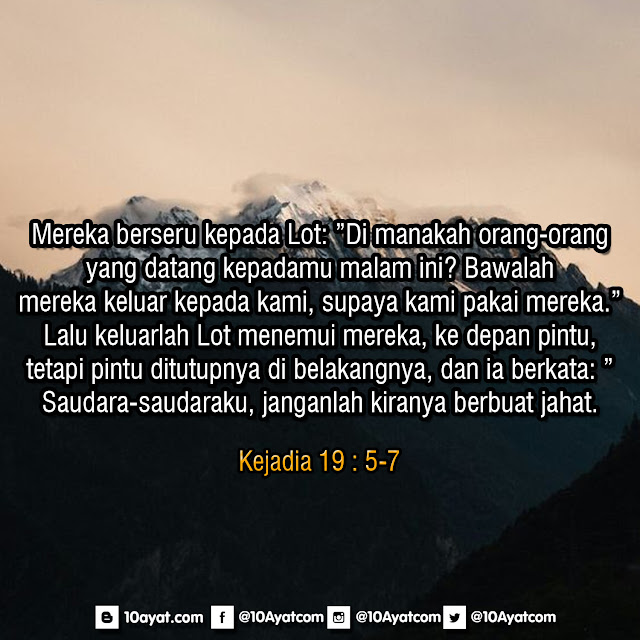 Mereka berseru kepada Lot: ”Di manakah orang-orang yang datang kepadamu malam ini? Bawalah mereka keluar kepada kami, supaya kami pakai mereka.” Lalu keluarlah Lot menemui mereka, ke depan pintu, tetapi pintu ditutupnya di belakangnya, dan ia berkata: ”Saudara-saudaraku, janganlah kiranya berbuat jahat.