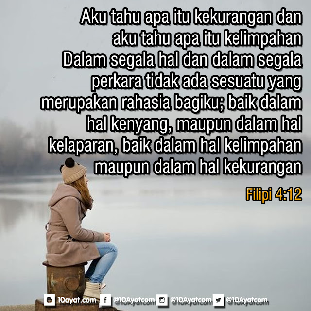 Aku tahu apa itu kekurangan dan aku tahu apa itu kelimpahan. Dalam segala hal dan dalam segala perkara tidak ada sesuatu yang merupakan rahasia bagiku; baik dalam hal kenyang, maupun dalam hal kelaparan, baik dalam hal kelimpahan maupun dalam hal kekurangan.