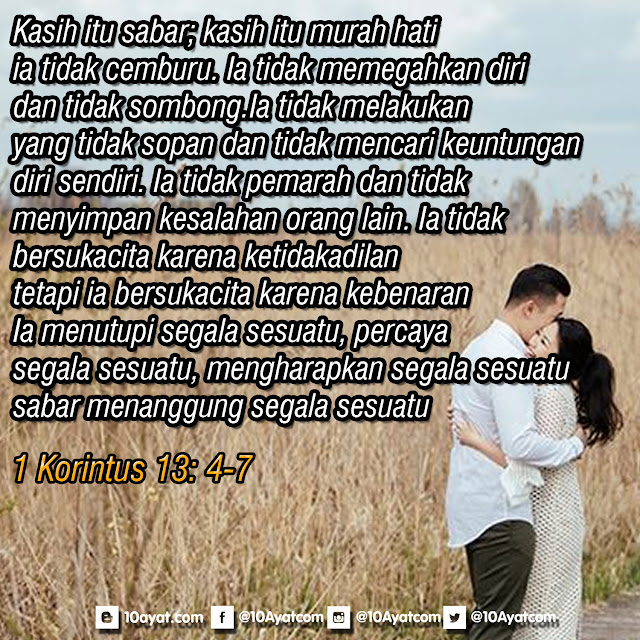 Kasih itu sabar; kasih itu murah hati; ia tidak cemburu. Ia tidak memegahkan diri dan tidak sombong. Ia tidak melakukan yang tidak sopan dan tidak mencari keuntungan diri sendiri. Ia tidak pemarah dan tidak menyimpan kesalahan orang lain. Ia tidak bersukacita karena ketidakadilan, tetapi ia bersukacita karena kebenaran. Ia menutupi segala sesuatu, percaya segala sesuatu, mengharapkan segala sesuatu, sabar menanggung segala sesuatu.