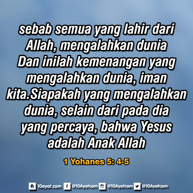 sebab semua yang lahir dari Allah, mengalahkan dunia. Dan inilah kemenangan yang mengalahkan dunia: iman kita. Siapakah yang mengalahkan dunia, selain dari pada dia yang percaya, bahwa Yesus adalah Anak Allah?