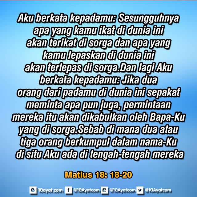 Aku berkata kepadamu: Sesungguhnya apa yang kamu ikat di dunia ini akan terikat di sorga dan apa yang kamu lepaskan di dunia ini akan terlepas di sorga.Dan lagi Aku berkata kepadamu: Jika dua orang dari padamu di dunia ini sepakat meminta apa pun juga, permintaan mereka itu akan dikabulkan oleh Bapa-Ku yang di sorga.Sebab di mana dua atau tiga orang berkumpul dalam nama-Ku, di situ Aku ada di tengah-tengah mereka.”