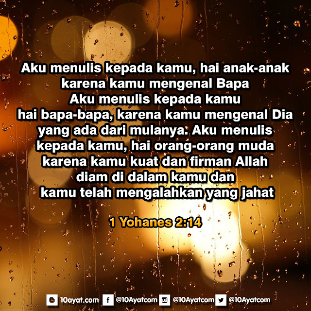Aku menulis kepada kamu, hai anak-anak, karena kamu mengenal Bapa. Aku menulis kepada kamu, hai bapa-bapa, karena kamu mengenal Dia, yang ada dari mulanya. Aku menulis kepada kamu, hai orang-orang muda, karena kamu kuat dan firman Allah diam di dalam kamu dan kamu telah mengalahkan yang jahat.
