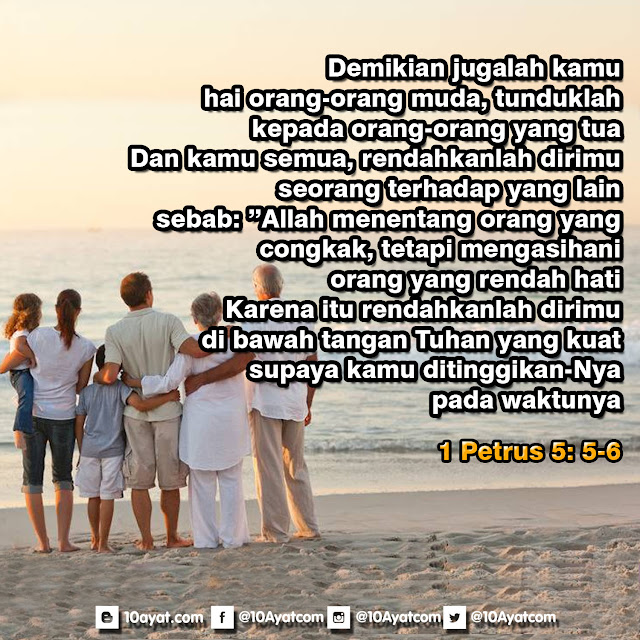 Demikian jugalah kamu, hai orang-orang muda, tunduklah kepada orang-orang yang tua. Dan kamu semua, rendahkanlah dirimu seorang terhadap yang lain, sebab: ”Allah menentang orang yang congkak, tetapi mengasihani orang yang rendah hati.Karena itu rendahkanlah dirimu di bawah tangan Tuhan yang kuat, supaya kamu ditinggikan-Nya pada waktunya.”