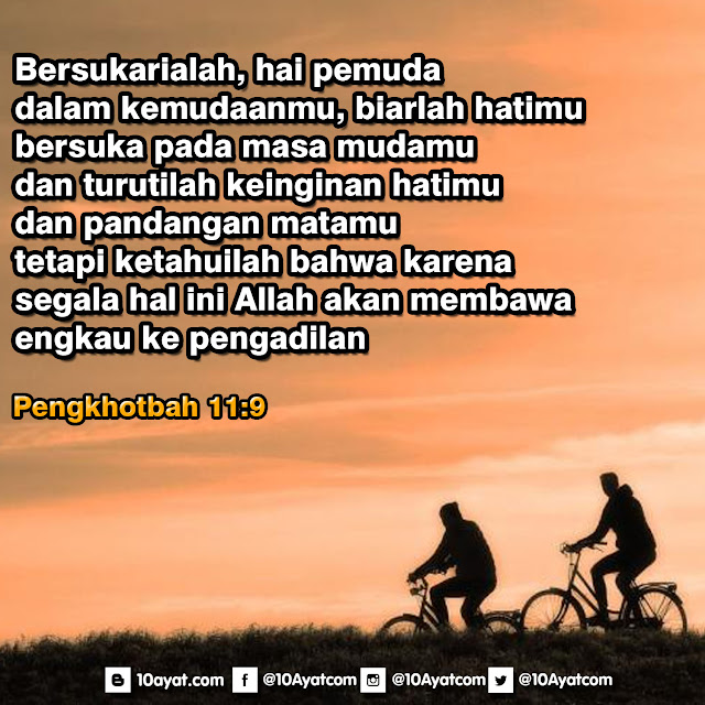 Bersukarialah, hai pemuda, dalam kemudaanmu, biarlah hatimu bersuka pada masa mudamu, dan turutilah keinginan hatimu dan pandangan matamu, tetapi ketahuilah bahwa karena segala hal ini Allah akan membawa engkau ke pengadilan!