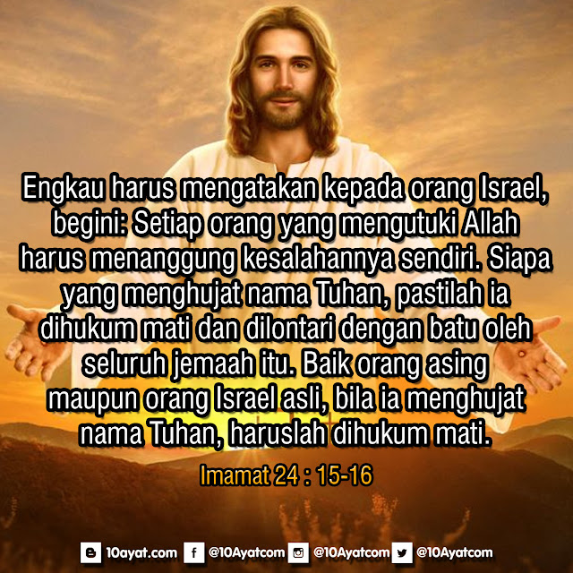 Engkau harus mengatakan kepada orang Israel, begini: Setiap orang yang mengutuki Allah harus menanggung kesalahannya sendiri. Siapa yang menghujat nama Tuhan, pastilah ia dihukum mati dan dilontari dengan batu oleh seluruh jemaah itu. Baik orang asing maupun orang Israel asli, bila ia menghujat nama Tuhan, haruslah dihukum mati.
