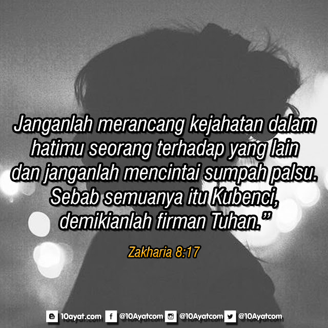 Janganlah merancang kejahatan dalam hatimu seorang terhadap yang lain dan janganlah mencintai sumpah palsu. Sebab semuanya itu Kubenci, demikianlah firman Tuhan.”