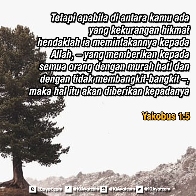 Tetapi apabila di antara kamu ada yang kekurangan hikmat, hendaklah ia memintakannya kepada Allah, – yang memberikan kepada semua orang dengan murah hati dan dengan tidak membangkit-bangkit –, maka hal itu akan diberikan kepadanya.