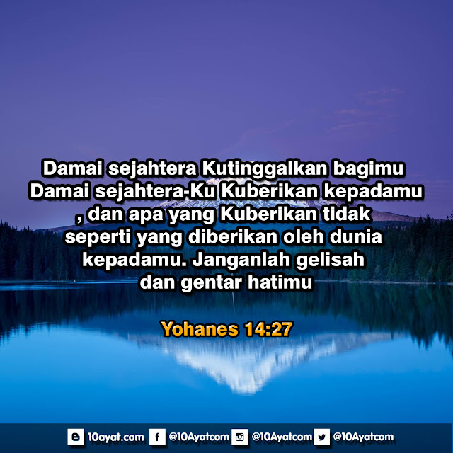 Damai sejahtera Kutinggalkan bagimu. Damai sejahtera-Ku Kuberikan kepadamu, dan apa yang Kuberikan tidak seperti yang diberikan oleh dunia kepadamu. Janganlah gelisah dan gentar hatimu.