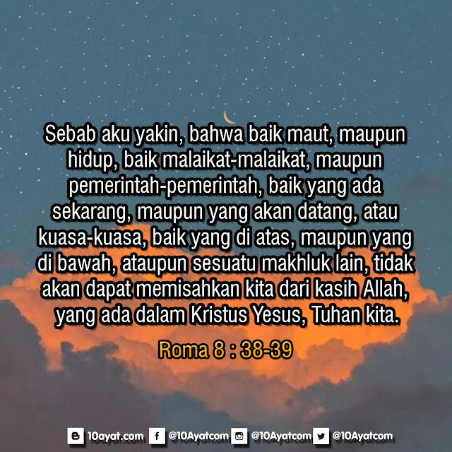 Sebab aku yakin, bahwa baik maut, maupun hidup, baik malaikat-malaikat, maupun pemerintah-pemerintah, baik yang ada sekarang, maupun yang akan datang, atau kuasa-kuasa, baik yang di atas, maupun yang di bawah, ataupun sesuatu makhluk lain, tidak akan dapat memisahkan kita dari kasih Allah, yang ada dalam Kristus Yesus, Tuhan kita.