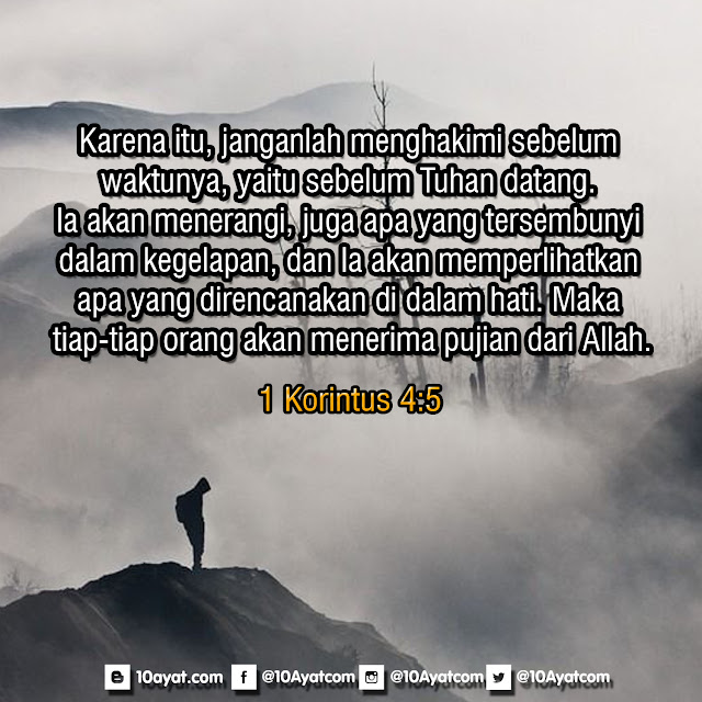 Karena itu, janganlah menghakimi sebelum waktunya, yaitu sebelum Tuhan datang. Ia akan menerangi, juga apa yang tersembunyi dalam kegelapan, dan Ia akan memperlihatkan apa yang direncanakan di dalam hati. Maka tiap-tiap orang akan menerima pujian dari Allah.