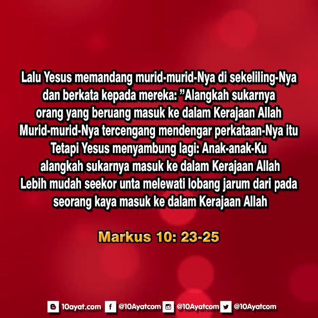 Lalu Yesus memandang murid-murid-Nya di sekeliling-Nya dan berkata kepada mereka: ”Alangkah sukarnya orang yang beruang masuk ke dalam Kerajaan Allah.” Murid-murid-Nya tercengang mendengar perkataan-Nya itu. Tetapi Yesus menyambung lagi: ”Anak-anak-Ku, alangkah sukarnya masuk ke dalam Kerajaan Allah. Lebih mudah seekor unta melewati lobang jarum dari pada seorang kaya masuk ke dalam Kerajaan Allah.”