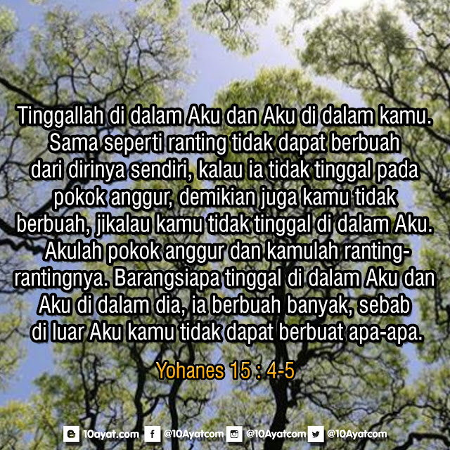Tinggallah di dalam Aku dan Aku di dalam kamu. Sama seperti ranting tidak dapat berbuah dari dirinya sendiri, kalau ia tidak tinggal pada pokok anggur, demikian juga kamu tidak berbuah, jikalau kamu tidak tinggal di dalam Aku. Akulah pokok anggur dan kamulah ranting-rantingnya. Barangsiapa tinggal di dalam Aku dan Aku di dalam dia, ia berbuah banyak, sebab di luar Aku kamu tidak dapat berbuat apa-apa.
