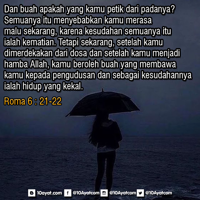Dan buah apakah yang kamu petik dari padanya? Semuanya itu menyebabkan kamu merasa malu sekarang, karena kesudahan semuanya itu ialah kematian. Tetapi sekarang, setelah kamu dimerdekakan dari dosa dan setelah kamu menjadi hamba Allah, kamu beroleh buah yang membawa kamu kepada pengudusan dan sebagai kesudahannya ialah hidup yang kekal.