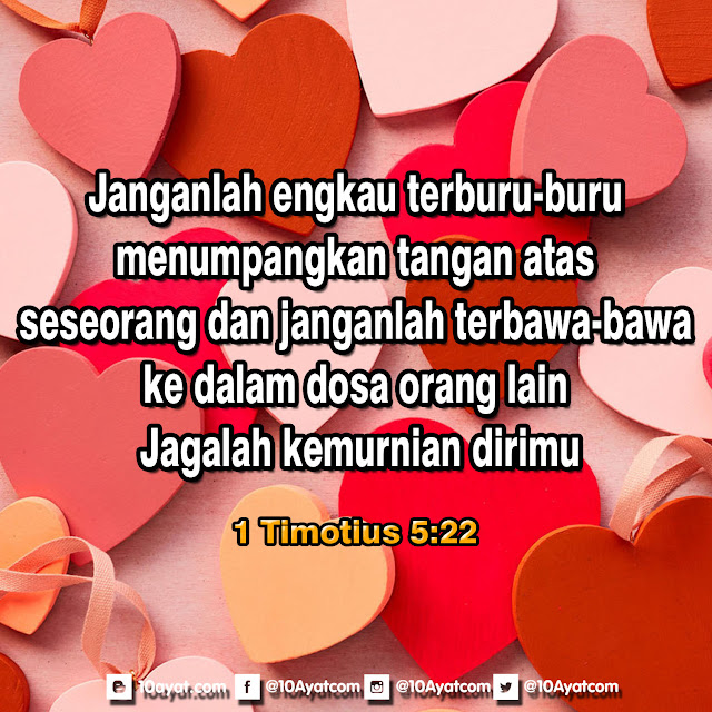 Janganlah engkau terburu-buru menumpangkan tangan atas seseorang dan janganlah terbawa-bawa ke dalam dosa orang lain. Jagalah kemurnian dirimu.