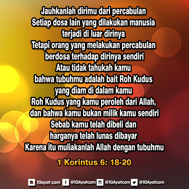 Jauhkanlah dirimu dari percabulan! Setiap dosa lain yang dilakukan manusia, terjadi di luar dirinya. Tetapi orang yang melakukan percabulan berdosa terhadap dirinya sendiri. Atau tidak tahukah kamu, bahwa tubuhmu adalah bait Roh Kudus yang diam di dalam kamu, Roh Kudus yang kamu peroleh dari Allah, – dan bahwa kamu bukan milik kamu sendiri? Sebab kamu telah dibeli dan harganya telah lunas dibayar: Karena itu muliakanlah Allah dengan tubuhmu!