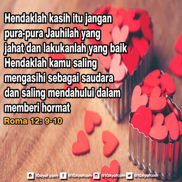 Hendaklah kasih itu jangan pura-pura! Jauhilah yang jahat dan lakukanlah yang baik. Hendaklah kamu saling mengasihi sebagai saudara dan saling mendahului dalam memberi hormat.