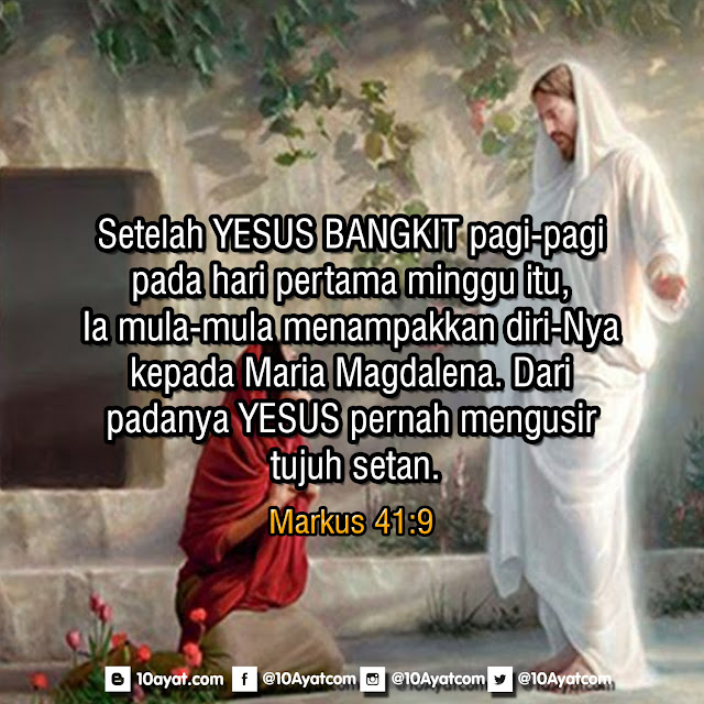 Setelah YESUS BANGKIT pagi-pagi pada hari pertama minggu itu, Ia mula-mula menampakkan diri-Nya kepada Maria Magdalena. Dari padanya YESUS pernah mengusir tujuh setan.