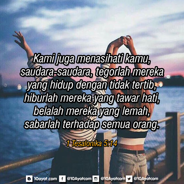Kami juga menasihati kamu, saudara-saudara, tegorlah mereka yang hidup dengan tidak tertib, hiburlah mereka yang tawar hati, belalah mereka yang lemah, sabarlah terhadap semua orang.