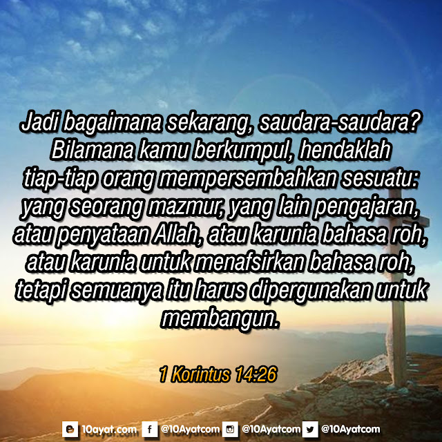 Jadi bagaimana sekarang, saudara-saudara? Bilamana kamu berkumpul, hendaklah tiap-tiap orang mempersembahkan sesuatu: yang seorang mazmur, yang lain pengajaran, atau penyataan Allah, atau karunia bahasa roh, atau karunia untuk menafsirkan bahasa roh, tetapi semuanya itu harus dipergunakan untuk membangun.