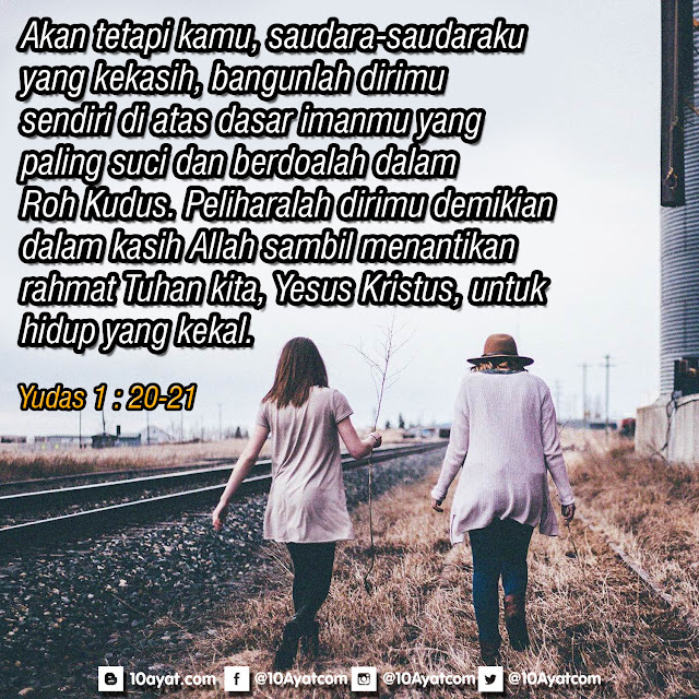Akan tetapi kamu, saudara-saudaraku yang kekasih, bangunlah dirimu sendiri di atas dasar imanmu yang paling suci dan berdoalah dalam Roh Kudus. Peliharalah dirimu demikian dalam kasih Allah sambil menantikan rahmat Tuhan kita, Yesus Kristus, untuk hidup yang kekal.