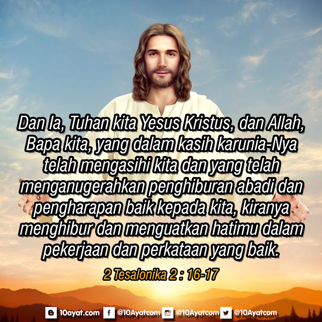 Dan Ia, Tuhan kita Yesus Kristus, dan Allah, Bapa kita, yang dalam kasih karunia-Nya telah mengasihi kita dan yang telah menganugerahkan penghiburan abadi dan pengharapan baik kepada kita, kiranya menghibur dan menguatkan hatimu dalam pekerjaan dan perkataan yang baik.