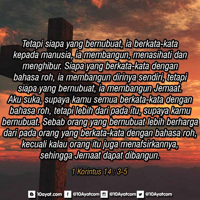 Tetapi siapa yang bernubuat, ia berkata-kata kepada manusia, ia membangun, menasihati dan menghibur. Siapa yang berkata-kata dengan bahasa roh, ia membangun dirinya sendiri, tetapi siapa yang bernubuat, ia membangun Jemaat. Aku suka, supaya kamu semua berkata-kata dengan bahasa roh, tetapi lebih dari pada itu, supaya kamu bernubuat. Sebab orang yang bernubuat lebih berharga dari pada orang yang berkata-kata dengan bahasa roh, kecuali kalau orang itu juga menafsirkannya, sehingga Jemaat dapat dibangun.