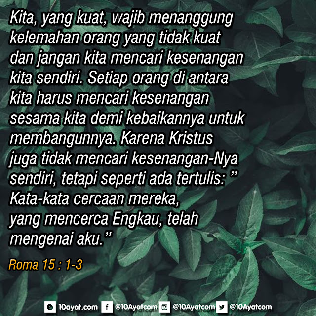 Kita, yang kuat, wajib menanggung kelemahan orang yang tidak kuat dan jangan kita mencari kesenangan kita sendiri. Setiap orang di antara kita harus mencari kesenangan sesama kita demi kebaikannya untuk membangunnya. Karena Kristus juga tidak mencari kesenangan-Nya sendiri, tetapi seperti ada tertulis: ”Kata-kata cercaan mereka, yang mencerca Engkau, telah mengenai aku.”