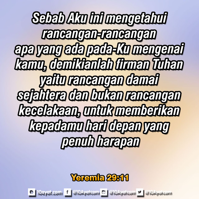 Sebab Aku ini mengetahui rancangan-rancangan apa yang ada pada-Ku mengenai kamu, demikianlah firman Tuhan, yaitu rancangan damai sejahtera dan bukan rancangan kecelakaan, untuk memberikan kepadamu hari depan yang penuh harapan.