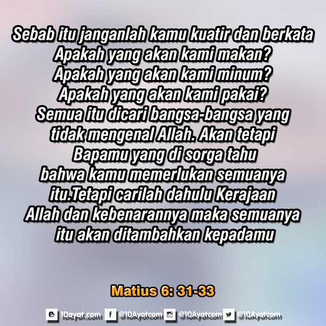 Sebab itu janganlah kamu kuatir dan berkata: Apakah yang akan kami makan? Apakah yang akan kami minum? Apakah yang akan kami pakai? Semua itu dicari bangsa-bangsa yang tidak mengenal Allah. Akan tetapi Bapamu yang di sorga tahu, bahwa kamu memerlukan semuanya itu. dan ampunilah kami akan kesalahan kami, seperti kami juga mengampuni orang yang bersalah kepada kami;