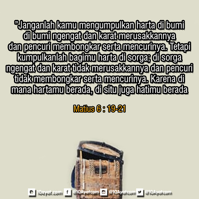 ”Janganlah kamu mengumpulkan harta di bumi; di bumi ngengat dan karat merusakkannya dan pencuri membongkar serta mencurinya. Tetapi kumpulkanlah bagimu harta di sorga; di sorga ngengat dan karat tidak merusakkannya dan pencuri tidak membongkar serta mencurinya. Karena di mana hartamu berada, di situ juga hatimu berada.