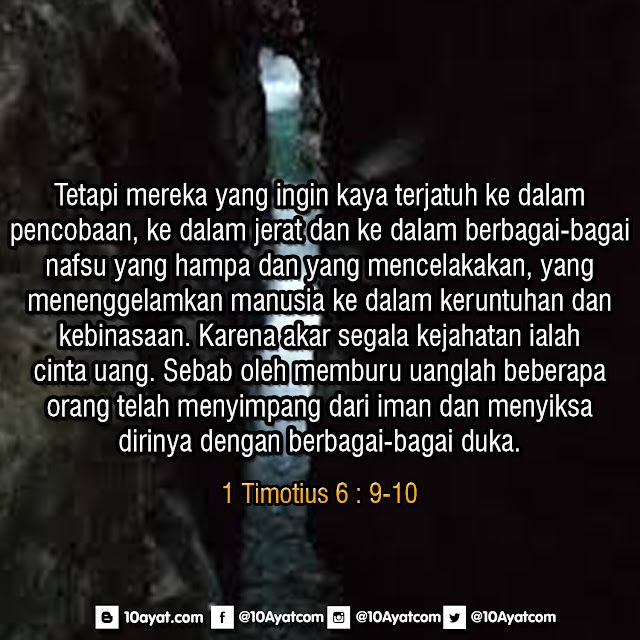 Tetapi mereka yang ingin kaya terjatuh ke dalam pencobaan, ke dalam jerat dan ke dalam berbagai-bagai nafsu yang hampa dan yang mencelakakan, yang menenggelamkan manusia ke dalam keruntuhan dan kebinasaan. Karena akar segala kejahatan ialah cinta uang. Sebab oleh memburu uanglah beberapa orang telah menyimpang dari iman dan menyiksa dirinya dengan berbagai-bagai duka.