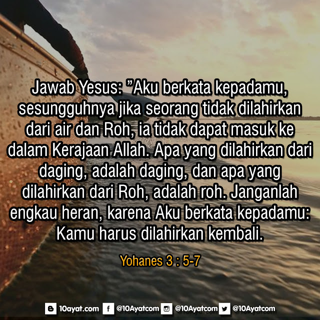 Jawab Yesus: ”Aku berkata kepadamu, sesungguhnya jika seorang tidak dilahirkan dari air dan Roh, ia tidak dapat masuk ke dalam Kerajaan Allah. Apa yang dilahirkan dari daging, adalah daging, dan apa yang dilahirkan dari Roh, adalah roh. Janganlah engkau heran, karena Aku berkata kepadamu: Kamu harus dilahirkan kembali.