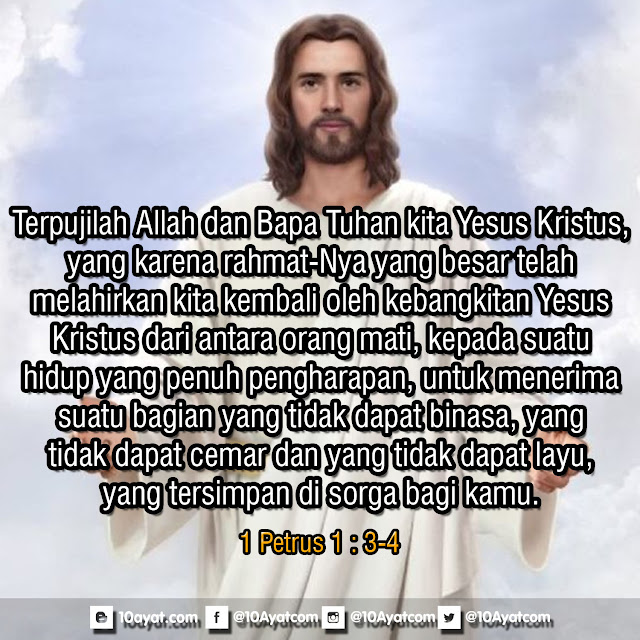 Terpujilah Allah dan Bapa Tuhan kita Yesus Kristus, yang karena rahmat-Nya yang besar telah melahirkan kita kembali oleh kebangkitan Yesus Kristus dari antara orang mati, kepada suatu hidup yang penuh pengharapan, untuk menerima suatu bagian yang tidak dapat binasa, yang tidak dapat cemar dan yang tidak dapat layu, yang tersimpan di sorga bagi kamu.