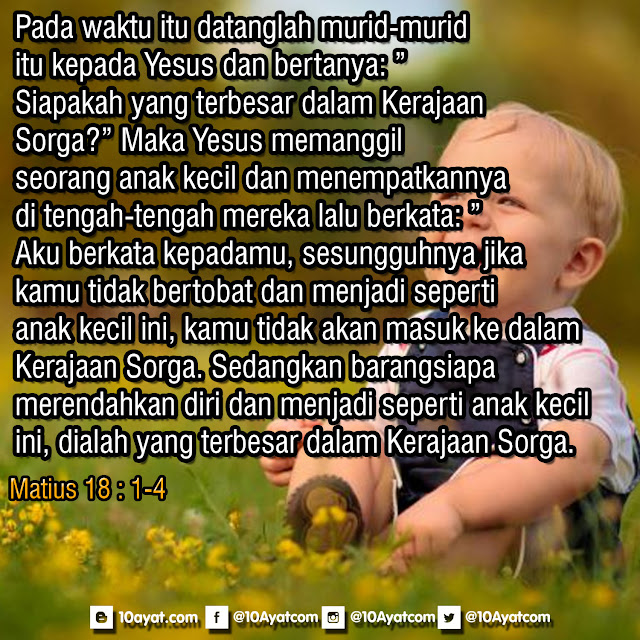 Pada waktu itu datanglah murid-murid itu kepada Yesus dan bertanya: ”Siapakah yang terbesar dalam Kerajaan Sorga?” Maka Yesus memanggil seorang anak kecil dan menempatkannya di tengah-tengah mereka lalu berkata: ”Aku berkata kepadamu, sesungguhnya jika kamu tidak bertobat dan menjadi seperti anak kecil ini, kamu tidak akan masuk ke dalam Kerajaan Sorga. Sedangkan barangsiapa merendahkan diri dan menjadi seperti anak kecil ini, dialah yang terbesar dalam Kerajaan Sorga.