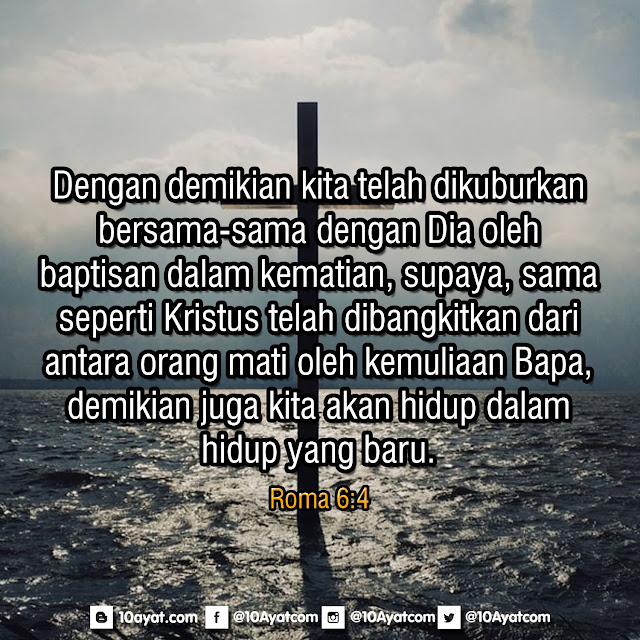Dengan demikian kita telah dikuburkan bersama-sama dengan Dia oleh baptisan dalam kematian, supaya, sama seperti Kristus telah dibangkitkan dari antara orang mati oleh kemuliaan Bapa, demikian juga kita akan hidup dalam hidup yang baru.