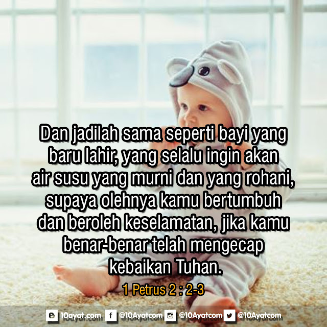 Dan jadilah sama seperti bayi yang baru lahir, yang selalu ingin akan air susu yang murni dan yang rohani, supaya olehnya kamu bertumbuh dan beroleh keselamatan, jika kamu benar-benar telah mengecap kebaikan Tuhan.